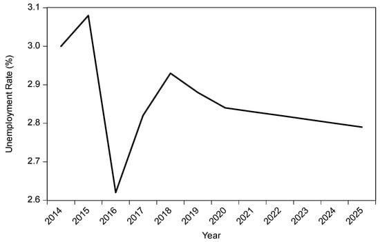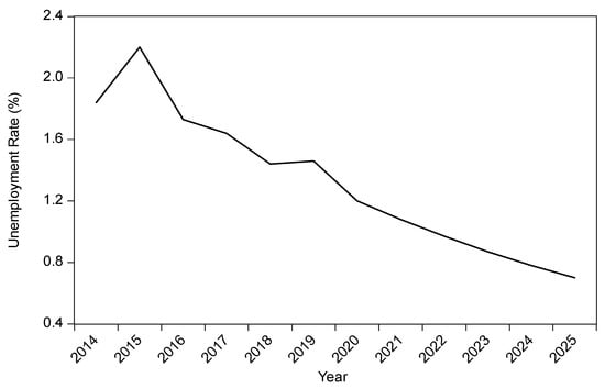 Regarding the unemployment rate in the Red River Delta’s rural area, as shown in Figure 3, the unemployment rate decreased for most of the period. On the one hand, there was only a sharp increase in the year 2015. In 2014, the number of unemployed in the total number of employed people was recorded at 1.84%. In 2015, the unemployment rate increased by approximately 20% to 2.2%, which declined by 21.4% to 1.73% in 2016. In the next three years, the unemployment rates were between 1.44% and 1.64%; it could continue this downward trend and decrease to 0.7% by 2025.