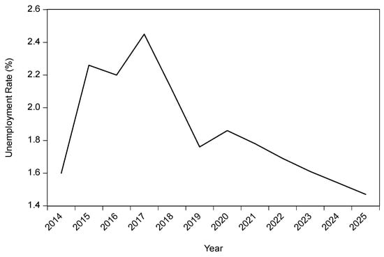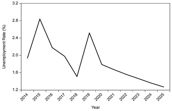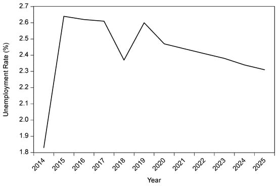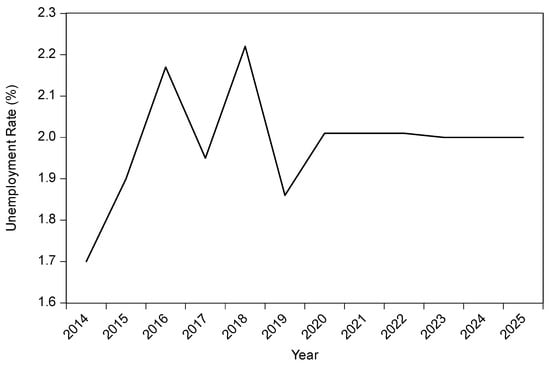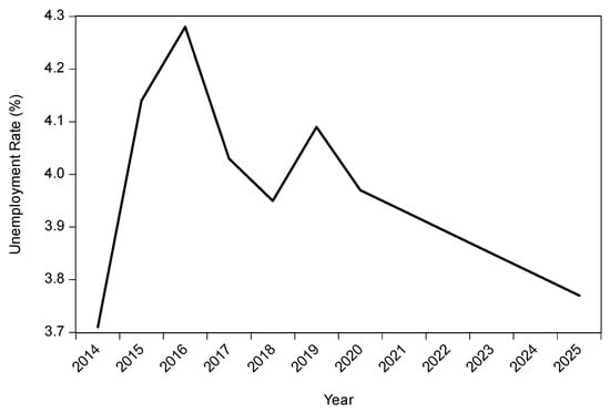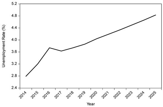 According to Figure 7, the unemployment rate increased continuously from around 12% to 14% in the first three years of the period. Nevertheless, it fluctuated around 2% in the next three years, and this trend is estimated to continue until 2025.