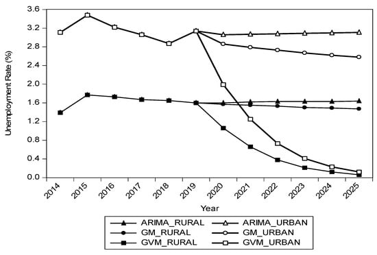 To fill this empirical research gap, the authors conducted novel and timeless research on this issue for a problematic paradigm in Vietnam. Three forecasting time series techniques of GM (1,1), GVM, and ARIMA model were employed in Vietnamese unemployment rates at six different regions for rural and urban areas. In this study, the period 2014 to 2019 was employed as the training dataset for estimating reliable predicting results using MAPE values. Then, the prediction for the unemployment rate for the following five years, 2020–2025, was provided. These forecasting techniques are compared in order to obtain a better understanding of their different strengths and shortcomings.