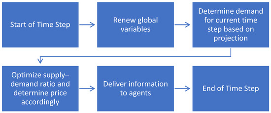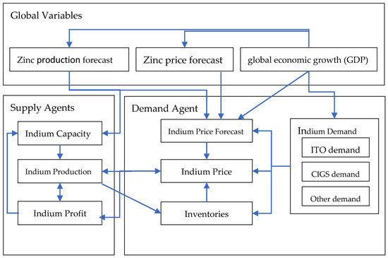 A total of 25 supply agents representing active indium metal producers listed by USGS indium minerals yearbook are included in the model [12]. A global demand agent is also created to manage demand, stock, and price changes. This agent represents a centralized indium market that adjusts global indium price based on supply–demand balance at each time step and exchanges decision-critical information with the rest of the model. The data dependency chart is shown in Figure 1.