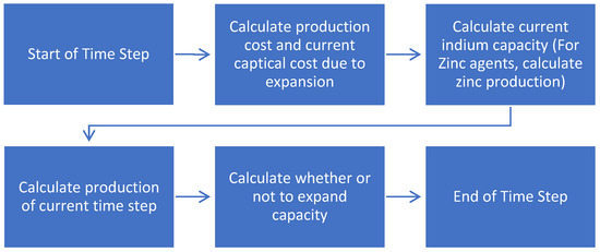 For each time step, supply agents make several decisions following the flow chart in Figure 3. First, the agents calculate any production cost and capital cost changes, either due to inflation or expansion. After that, zinc-based agents decide their zinc production of the current step. The total amount of zinc capacity taken into consideration by this study is only 1/3 of global primary zinc capacity [54]. The zinc market is therefore treated as a market with perfect competition and optimized accordingly [15]. The formulation of the optimization problem is listed as below: