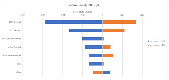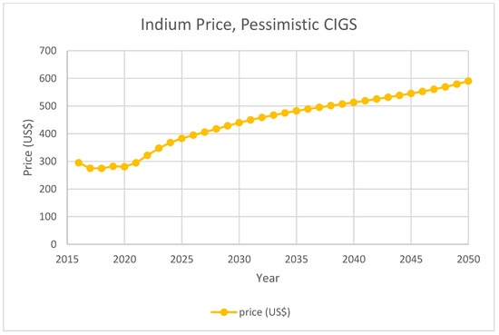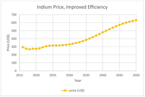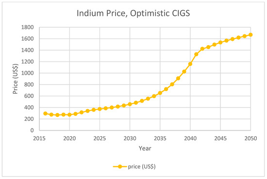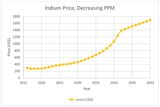 Meanwhile, research was conducted to assess the impact of photovoltaics technology on by-product metal demand. Several reports focused on projections of by-product metal demands induced by CIGS solar panels [21,22,23]. Kavlak et al. discussed indium demand projection for CIGS indium consumption based on least square regression over historical growth rate. Nassar et al. discussed projected U.S. CIGS demand for indium based on future parameter estimation. Stamp et al. discussed different indium demands under various energy scenarios using system dynamics modeling. Moreover, to deal with the price change caused by possible supply deficit, the price impact of indium on both ITO and solar PV industries was reported. It is reported that flat panel industry is unlikely to be impacted by Indium price increase [24]. Candelise et al. discussed critical metal price impact on thin-film solar panels using cost analysis [25]. A system dynamics model with price elasticities and a mixed integer linear programming model that optimized global production cost were also employed to analyze the indium supply–demand balance [26,27].