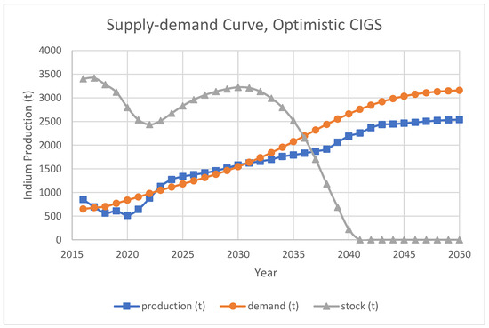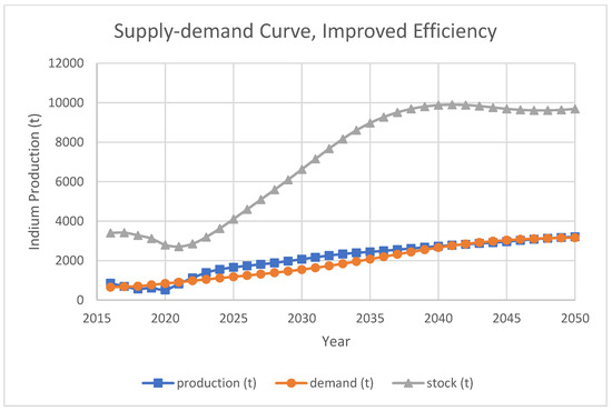 The results for both scenarios are shown in Figure 14, Figure 15, Figure 16 and Figure 17, respectively. It is apparent that efficiency of smelters is vital to indium supply. If the primary supply of indium-containing ore could not maintain current quality, supply shortage occurs. Meanwhile, improvements on indium overall efficiency are extremely effective, and indium supply with improved efficiency is sufficient to meet the optimistic CIGS projection demand.