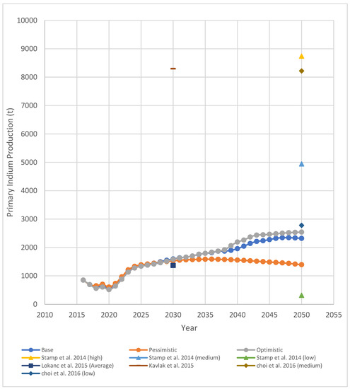 Some researchers also dealt with minor metal reserves. Both USGS and NREL reports provided estimations on indium reserves of roughly 15,000 t [9,12]. A three-part research report summarized current assessment of minor metal reserves and specifically applied a new investigative method to assess indium reserves [18,19,20]. The research estimated total indium reserves to be as much as 356,000 t (without assessing economic feasibility).