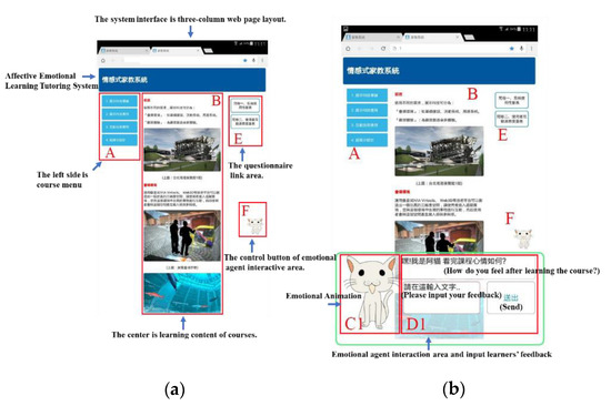 System interface. (a) Three-column web page layout. (b) Emotional agent interactive area and input learners’ feedback.