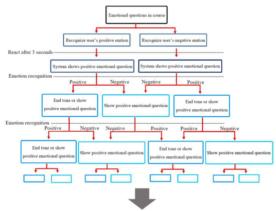 Emotion classification is a basic issue in affective computing. There are two main classification methods: one is discrete categories, and the other is continuous vector space [21]. In discrete categories, Ekman, Friesen, and Ellsworth [24] defined six expressions of human faces based on facial muscles and facial features: happiness, anger, sadness, surprise, disgust, and fear. Metri, Ghropade, and Butalia [25] used Ekman’s FACS feature regulations to develop the Facial Expression Recognition System (FERS). In terms of the state of learning, learning emotions are divided into eight types, which include: pleasure, hope, pride, anger, anxiety, shame, hopelessness, and boredom. Positive emotions in learning (pleasure, hope, etc.) and negative emotions in learning (anger, anxiety, etc.) are all multiple emotions that will be experienced in learning [26]. In the emotion classification of continuous vector space, the most common one is James Russell’s Circumplex Model [27,28]. In this classification method, emotions are divided into two axes, “Arousal” and “Valence”, to form all possible emotions. The various discrete categories mentioned above are located in the quadrants formed by the two axes. The PAD three-dimensional emotional model is proposed by Mehrabian and Russell [29] based on environmental psychology and is mainly used to describe and quantify emotional states. Among them, the degree of pleasure (displeasure–pleasure) represents the positive and negative degree of the individual; the degree of arousal (nonarousal–arousal) represents the physiological arousal state of the individual; the degree of submissiveness (submissiveness–dominance) represents the degree of personal dominance over others; and the values of each degree are between from −1 to 1, so that the researcher can clearly define different emotions by the numerical value of the three dimensions. Most of the past studies only focused on the degree of pleasure and the degree of arousal, but some emotions cannot be effectively distinguished using two dimensions (such as fear and anger), so the degree of strength plays a very important role in the PAD three-dimensional emotional model. More advanced, Mendez-Alegria, Y. et al. [30] demonstrated the Wheel of Emotions of Geneva + instrument, which aims to evaluate the emotional state of the user during the execution of tasks in the interactive system. In this method, the author takes “Pleasant” and “Control” as the two axes and forms four facets: satisfied, dissatisfied, enthusiastic, and unenthusiastic. The above-mentioned various discrete categories are located in these four facets [30,31,32,33]. In this study, in order to comply with Figure 1, the process chart of emotional feedback guiding, a relatively simple emotion classification method is adopted, and we only divide it into positive and negative emotions. The decision tree composed of these two emotions constitutes the design of each emotion feedback. Judgment of affective factors can help learning. The system obtains learners’ emotions through facial and semantic emotion recognition, and guides learners to continue teaching activities with positive emotions through interactive agents. The research results show that the assistance of interactive agents can increase learning motivation [34,35,36]. In Figure 1, the system interface is three-column web page layout. The left side is course menu, the center is course information, and the right side is the control button of emotional agent interaction area and the questionnaire link area. The system displays the interactive learning question and learners can input the feedback in the emotional agent interactive area.