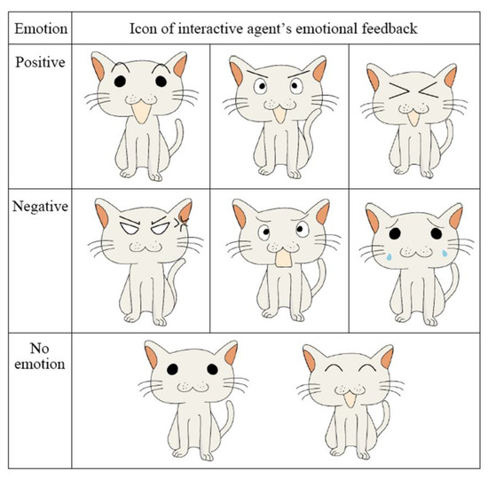 Emotional balance represents an important state of mind. The balance means that there is a certain degree of constant energy in the human body, which tends to be evenly distributed. This volume represents the moderate tension in the human body, and the restoration to a moderate state represents balance. Many studies have included this dimension in the evaluation methods (such as questionnaires) to measure it [31,38] and although this study did not evaluate emotional balance, we try to achieve emotional balance through emotional feedback from the system. Norman [39,40] pointed out that for users to form a conceptual model, it is difficult to achieve it without systematic feedback. The user will have obvious emotional ups and downs due to the presence or absence of the intelligent agent. At the same time, the user can increase the efficiency of learning through interaction with the intelligent agent, and the more the agent’s compassionate and encouraging sentences can be used the more the mental state of the person remains positive and can cope with continuous learning. The function of intelligent agents can affect students’ learning emotions and can guide learning as well as detect students’ learning conditions [10,11]. An Affective Tutoring System (ATS) is a system that can provide users with appropriate teaching content through computer calculations and analysis and can directly give users instant feedback. The users give appropriate feedback, so the smart tutoring system has more advantages compared with traditional teaching [41,42].