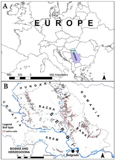 The geographical position of (A) Serbia and the Vojvodina region, and the distribution of saline soils across the Vojvodina region (B).