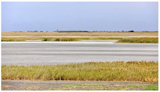 Rusanda (or Velika Rusanda) is one of the largest alkaline salt lakes in Serbia (Figure 7C). It is located in the central part of the Vojvodina region, near western side of Melenci settlement, 16.5 km northwest of the City of Zrenjanin. Like Slano Kopovo, this site also has formed in a paleomeander of a Tisa River terrace [27,28]. The lake at Rusanda has, therefore, slightly elongated and curved shape (Figure 7). It is a shallow, semistatic water body with a maximum depth of less than 1.5 m, which is achieved during the spring season. The approximate aquatoria of Lake Rusanda is 1.5 km2. The noteworthy characteristic of this lake is its muddy springs on the lake bed. Unlike most freshwater lakes, this saline lake is a closed system (without outflow) fed by surface inflow (runoff), direct precipitation and different ground water sources including the upflow of abyssal waters [32].