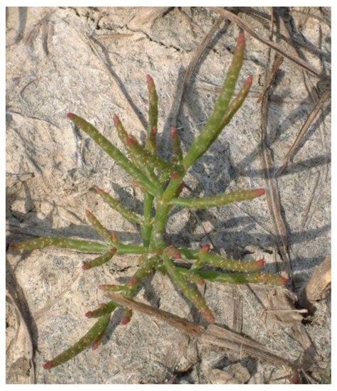 Halomorphic vegetation has clear endemic characteristics. For example, succulent plants like Salicornia europea L. (Figure 5) Slano Kopovo is the only remaining habitat in Serbia, while Suaeda pannonica (G. Beck) Ascherson & Graebner was confirmed at only three localities—Slano kopovo, Rusanda and Okanj bara [26]. Those two species plus Suaeda maritima (L.) Dumort. and Salsola soda L. are characterized for solonchak soils.