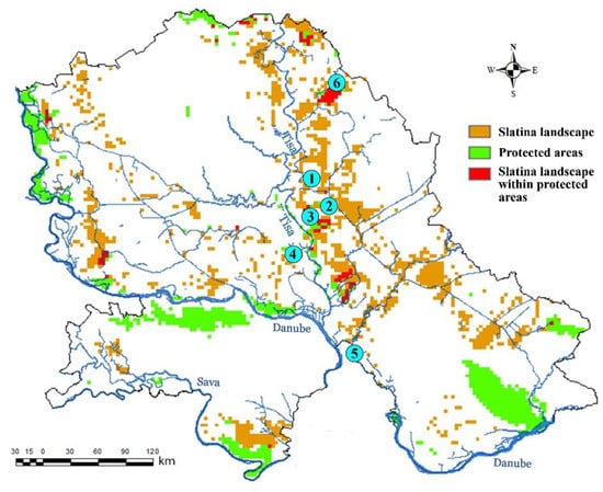 Map of slatina landscapes in the Vojvodina region within and outside of otherwise protected areas: ①—Slano Kopovo, ②—Jegrička, ③—Rusanda, ④—Okanj Bara, ⑤—Pečena Slatina, ⑥—Pašnjaci Velike Droplje.