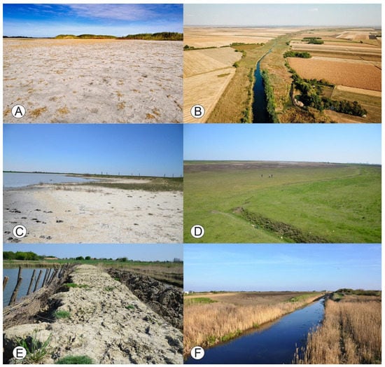 The various saline soil landscapes discussed in this paper (A)—Slano Kopovo, (B)—Jegrička, (C)—Rusanda, (D)—Okanj Bara, (E)—Pečena Slatina, (F)—Pašnjaci Velike Droplje. Photos by Slobodan Marković, Lazar Lazić and Tijana Đorđević.