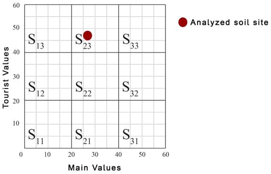 In the assessment process, every subindicator was rated by experts on a 5-point likert scale, with each subindicator given a value from 1 to 5. These values and how they are rated are explained in more detail in Table 2. Upon the rating of each subindicator, the values are added up separately, first the 12 subindicators from the Main Values (MV) group, and then the 12 subindicators from the Tourist Values (TV) group. Finally, the sum of Main Values and the Tourist Values are added together. The results are presented in a matrix (Figure 8) which consists of Main Values axis (X) anda Tourist Values axis (Y). The matrix is divided into nine fields and each analyzed site is then placed into one of the fields, depending on the additive score of its Main Values (MV) and Tourist Values (TV). For example, if the sum of Main Values is 27 and of Tourist Values is 47, the analyzed soil site would be in the S23 field of the matrix, indicating a medium level on Main Values and a high level on Tourist Values.
