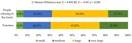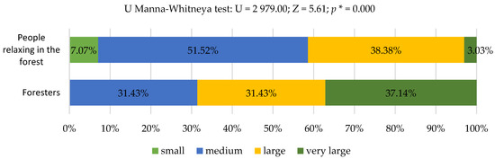 Among the interviewed foresters, the prevailing opinion (37.14%) was that the effects of climate change are visible in the forest to a very large extent (n = 204). On the other hand, in the group of people relaxing in the forest, 41.41% were convinced that they are visible to a large or very large extent. A significant number of these respondents felt that such changes are visible to an average extent. Distribution of responses of analyzed groups was statistically different (Figure 2).