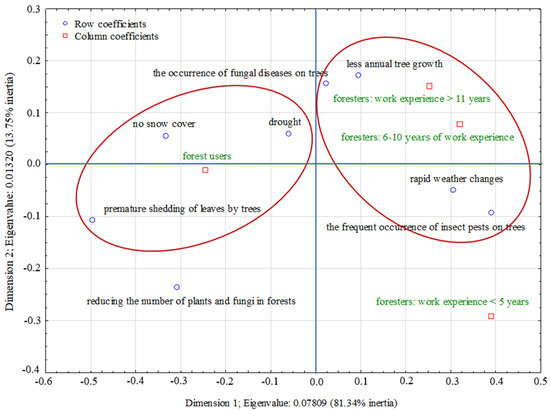 The total inertia was 0.096 and was indicative of the low dispersion of the analyzed profiles. The two dimensions together explained 95.09% of the inertia (axis 1—81.34%, axis 2—13.75%). As shown in Figure 4, the opinions of both foresters, including foresters with different tenures, and recreational forest users differed significantly on the perception of climate change effects in the forest. Foresters with seniority of 6–10 years and more than 10 years expressed similar opinions about the consequences of climate change. Those relaxing in the forests paid particular attention to phenomena such as drought and lack of snow cover.