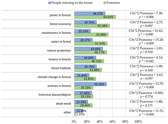 All foresters were involved in conducting forest education. The vast majority of recreational forest users (96.58%) came into contact with foresters’ educational activities. The foresters much more often than the recreational forest users declared that the main topics of forest education were forest plants, mushrooms, water management, and forest management. According to the recreational forest users, the most common topics of forest education they encountered were animals living in forests, followed by plants and protecting nature (Figure 5).