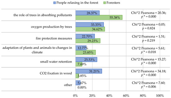 In the opinion of foresters, the following issues should appear in their climate education: the role of trees in absorbing pollutants (55.38%) and oxygen production by trees (34.62%). In the opinion of recreational forest users, the most desirable topics are oxygen production by trees (33.33%) and CO2 fixation in wood (31.21%). The answers in both groups were statistically significantly different. Exceptions in this context were the role of forests in the absorption of pollutants and the adaptation of plants to climate change. The largest differences in responses occurred in the context of CO2 fixation in wood (3.85%) and the role of trees in absorbing pollutants (27.01%) (Figure 8).