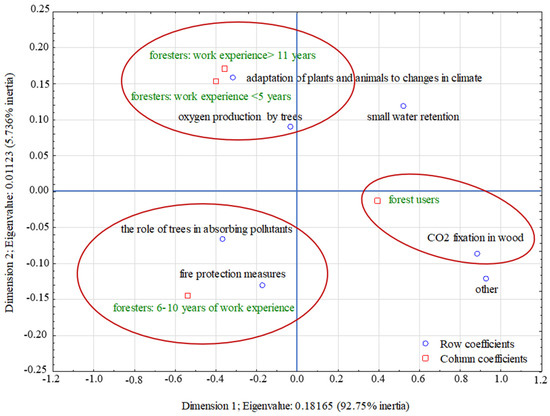 The total inertia was 0.196, indicating that the profiles were highly dispersed. The two dimensions together explained 98.49% of the inertia (axis 1—92.75%, axis 2—5.74%). Analyzing the distribution of scores (Figure 9), it can be seen that on the negative side of the axis of the first dimension were foresters of different seniority and on the positive side were forest recreationists. These groups differed in the respondents’ perception of education in the context of climate change. The youngest and oldest foresters associated classes on climate change and its protection with classes on oxygen production by trees and adaptation of plants and animals to climate change. Foresters with a tenure of 6–10 years associated them with tree planting and fire protection activities. According to recreational forest users, such activities mainly concern CO2 fixation in wood (Figure 9).