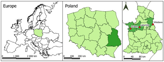 The research was carried out in three Forest Districts (Puławy, Lubartów, and Włodawa) belonging to one of the 17 Regional Directorates of State Forests in the Poland-Regional Directorate of State Forests in Lublin (Scheme 1).
