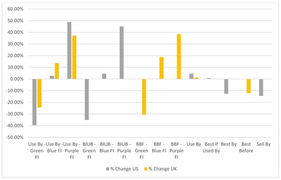 Average high adjusted probability to waste by date label treatments (% change from control). Note: The acronym BIUB denotes “Best If Used By” and BBF denotes “Best Before”.