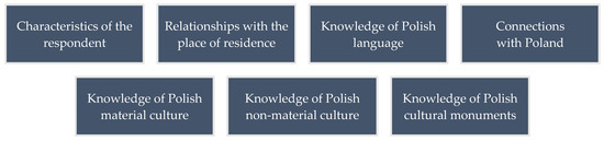 The questionnaire of the survey entitled “Memory and Heritage” (paper-and-pencil (PAP) survey) [57] included questions concerning the knowledge of Polish cultural heritage in the Polish-Ukrainian borderland. The questionnaire comprised 41 questions and 175 various answers to choose from. The questions were grouped into seven blocks: (1) general characteristics of the respondent; (2) connections with the place of residence, and the attitude towards the place of residence (permanent/temporary); (3) knowledge of Polish language; (4) current connections with Poland (family/work/tourism); (5) recollections and knowledge of Polish material culture; (6) recollections and knowledge of Polish non-material culture; (7) knowledge of Polish cultural monuments, including local natural and landscape formations (complexes) being part/an achievement of Polish culture (Figure 1).