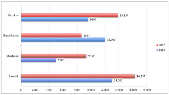 The current total population of the cities under study (Horodok, Zhovkva, Mostyska, and Rava-Ruska) does not differ significantly from that before the Second World War, and ranges from 5000 (Mostyska, year 1914) to 16,000 (Horodok, year 2017) (Figure 2). On the other hand, the national structure of these cities, which has undergone radical changes, is different.