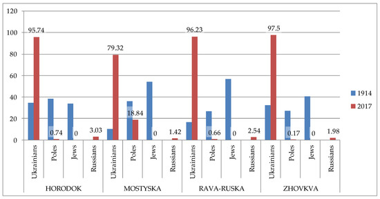 Figure 3. The ethnic structure of Eastern Galicia towns in 1914 and 2017 (%). Source: Original work based on [59,60,61].