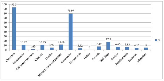 The fifth and sixth block provided questions that concerned knowledge of the Polish cultural heritage, both material and non-material. The questionnaire included questions about the knowledge of objects divided into 15 types (Figure 4). The study showed that in the collective memory of the current residents, mostly Ukrainians, 75 years after the forced relocation of Poles, religious objects, i.e., churches (93.3%) and cemeteries (80%) were dominant. It can therefore be concluded that despite the deliberate destruction of these objects under the communist rule (1945–1991), the memory of them was still alive, perhaps due to their visual domination.