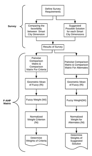 F-AHP is a reflection of human thinking when dealing with uncertain information to reach a certain decision. In short, F-AHP is a more advanced form of multi-criteria analysis, although the traditional multi-criterial analysis has been used in several applications before, such as re-designing transport systems [42] and evaluating parking spaces in cities [43]. The analytical hierarchy process (AHP) in general is a decision-making technique that aids in the solution of complex multiple criteria problems in a number of application domains [44,45,46]. AHP is an effective and practical approach that considers complex and unstructured decisions [47]. The outcome of AHP generally is a prioritized ranking or weighting of each decision alternative, based on the application [44]. F-AHP is similar to AHP in all aspects except that F-AHP sets the AHP scale into the fuzzy triangle scale instead of discrete numerical data. Fuzzy logic in general is powerful in representing the uncertainty of human judgment [48]. This makes it even easier to deal with the qualitative and quantitative data, and to use the hierarchy processes and pairwise comparison matrix to reduce conflicts and reach the fuzzy weight phase for each criteria and alternate solution [49].