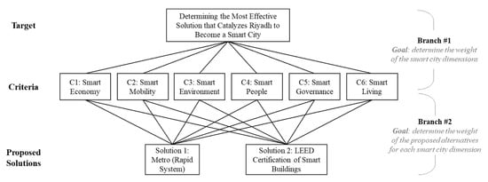 A survey was developed that targeted engineers in general and sustainability. There were two types of questions on the survey: The first one aimed at identifying the weights of the six dimensions for measuring the “Smart City Index” for Riyadh. In other words, the first part of the survey was concerned with determining the relative importance of the six indicators of smart cities specifically for Riyadh. The second question type in the survey was related to determining which possible solution would be plausible for each smart city dimension, with two alternative solutions suggested in order to identify the most beneficial one for Riyadh. The first solution was A1: the construction of a metro network to link all of Riyadh to align with the government objective for 2030. The second solution was A2: encouraging the construction of green and smart buildings through Leadership in Energy and Environmental Design (LEED) certification.