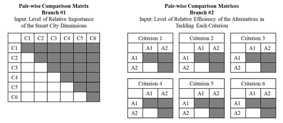 The F-AHP process starts by recognizing the criteria affecting the performance index of the sustainable energy planning components and categorizing them into the main criteria and their related factors. The structural hierarchy of F-AHP is presented in Figure 2. The F-AHP procedure is divided into two branches: The first branch is to determine the weight of the smart city dimensions (C1 to C6), and the second branch is to determine the weight of the proposed alternatives (A1 and A2) for each smart city dimension.