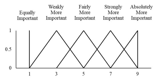 The fuzzification scale process is similar to Saaty’s fuzzification scale, where the variance between the most probable (the actual response from experts) and the upper and lower matrices is equal to one. This process was applied to all the pairwise comparisons that were collected from experts via the survey. The fuzzification scale used is presented in Table 1. The corresponding triangular fuzzy sets are demonstrated in Figure 4.