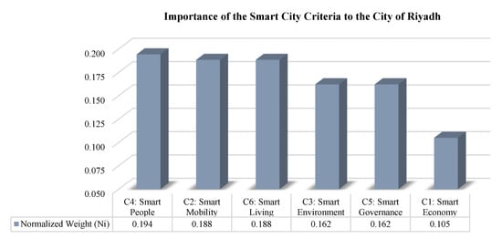 The fuzzification and defuzzification process (stated in the methodology) was applied, and the resulting normalized weight for each criterion is presented in Figure 5. It can be concluded from the figure that the most significant criteria in terms of importance to Riyadh city were C4: Smart People (19.4%), C2: Smart Mobility (18.8%), and C6: Smart Living (18.8%). These elements can be described as those that the experts perceived to need more focus from the Saudi authorities in order to progress and catalyze the transformation of Riyadh into a smart city. An interesting observation in these results is that the three most important criteria to the Saudi public are those related to their personal quality of life in (Smart People, Smart Mobility, and Smart Living). These are the three criteria that directly influence citizens. The other three criteria (Smart Environment, Smart Governance, and Smart Economy) influence citizens, but in an indirect way. As such, this observation could help the Saudi government in setting development priorities to address issues that directly affect the citizens first, and then address the more indirect ones later.