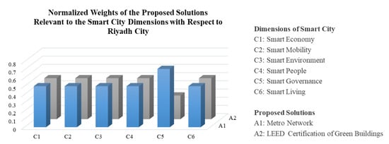 Two solutions were also proposed and studied using F-AHP, namely, (1) the construction of a metro network to link all of Riyadh to align with the government objective for 2030, and (2) encouraging the construction of green and smart buildings through LEED certification. After the analysis, the F-AHP results about the proposed solutions relevant to the smart city dimensions were as follows: