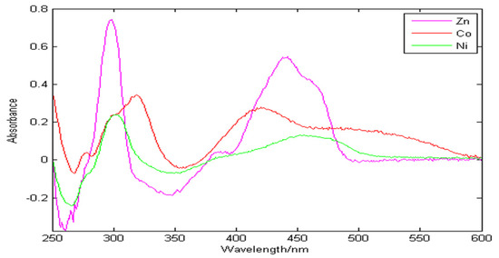 The signal was collected by the microfiber spectrometer in the zinc wastewater solution. Figure 1 shows the absorption spectra of Zn (30 mg/L), Co (1.2 mg/L) and Ni (3.0 mg/L) at the wavelength of 250–600 nm. It can be seen that the spectral signals of zinc, cobalt and nickel overlap heavily over the entire wavelength region. Since the concentration of zinc ions in the wastewater solution is much greater than other trace metal ions, the zinc absorbance is higher than other ions. Among nickel and cobalt ions, the concentration of nickel is higher, but the absorbance is lower, and so the sensitivity to nickel is lower. In addition, the spectral signals of three metal ions are interfered with by noise, because the microfiber spectrometer is designed as a single beam. Compared with the large fiber optic spectrometer with a dual beam, the microfiber spectrometer has the characteristics of miniaturization, modularization and fast detection speed, which makes it suitable for fast online detection in the industrial field; but the disadvantage is that the CCD device has considerable spectral noise. The random fluctuation of noise seriously affects the quantitative analysis of UV-vis spectra. Thus, it is difficult to detect the polymetallic ions of Zn, Co and Ni in the wastewater solution.