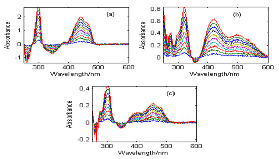 Generally, in zinc industrial wastewater, the major zinc concentration is usually in the range of 10–100 mg/L. The concentrations of trace amounts of Ni and Co are 0.6–6 mg/L and 0.3–3 mg/L, respectively. The absorbance spectra of the three metal ions with different concentrations are shown in Figure 2. It can be seen that the spectra have much interference over the entire wavelength region. To evaluate the linearity of these ions in the zinc wastewater solution, a calibration curve for each metal ion is constructed using the maximum absorbance and the corresponding concentration. Figure 3a shows the calibration curve for Zn at 303 nml; the linear equation and correlation coefficient (R2) are: Abs. = 0.0264 CZn −0.0649 (R2 = 0.9854). Figure 3b shows the calibration curve for Co at 322 nm, the linear equation and correlation coefficient (R2) are: Abs. = 0.2767 CCo + 0.0003 (R2 = 0.9912). Figure 3c shows the calibration curve for Ni at 305 nm, the linear equation and correlation coefficient (R2) are: Abs. = 0.0704 CNi + 0.0057 (R2 = 0.9837). Obviously, due to the influence of noise, the linearity of these ions is still poor, even at the highest sensitivity, which will seriously affect the quantitative analysis of the spectral signal. Thus, it is necessary to perform spectral preprocessing before modeling analysis.