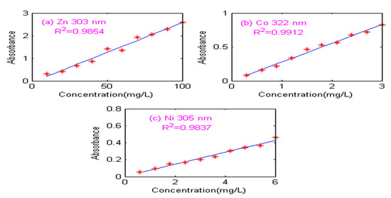 The calibration curves for Zn, Co and Ni. (a) The calibration curve for Zn at 303 nm. (b) The calibration curve for Co at 322 nm. (c) The calibration curve for Ni at 305 nm.