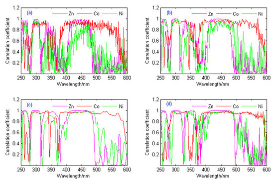 In order to improve the linearity of the spectral signal, three spectral pretreatment methods, Savitzky–Golay (SG), Fourier transform (FT) and wavelet transform (WT), were used for the original spectral data, as shown in Figure 4. The linearity of each metal ion was evaluated by the correlation coefficient of absorbance and concentration. The larger the correlation coefficient at a certain wavelength, the better the linearity at that wavelength. Figure 4a shows the correlation coefficient of the original spectra in the wavelength range of 250–600 nm. It can be seen from Figure 4a that the linear correlation coefficients of the three metal ions vary greatly, and the maximum values are all less than 0.96, indicating that each metal ion has poor linearity and a small number of optional modeling wavelengths. The correlation coefficients of Figure 4b–d are the results of preprocessing by SG, FT, and WT methods, respectively. It can be seen that the three methods all significantly improve the linear correlation coefficient, and the change of linear correlation coefficient is relatively stable, with the maximum value close to 1. The reason is that spectral preprocessing effectively eliminates noise and enhances spectral feature information, thereby improving the linearity of the detected ions and increasing the number of selectable modeling wavelengths, which facilitates subsequent wavelength selection and modeling analysis.
