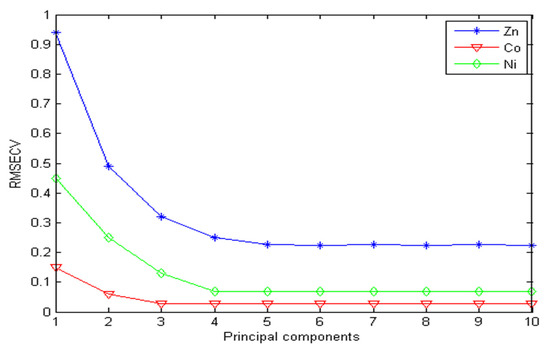 The PLSR method has been widely used to simultaneously determine compounds with a certain overlap in the UV-vis spectra. Compared to the full-spectrum method, selecting the most informative variables or eliminating non-information variables is beneficial to the PLSR model to minimize the error and enhance prediction ability. It can be seen from Figure 4 that after spectral pretreatment by wavelet transform, the wavelength variables with a correlation coefficient greater than 0.96 are selected, so that the initial variables of Zn, Co and Ni are 109, 127, and 74, respectively. Thirty sets of mixed solutions were used to construct a calibration set. In order to find the optimal model, after the addition of each new factor, the prediction residual error sum of squares (PRESS) and the root-mean-square error of cross-validation (RMSECV) were recalculated for each metal ion separately. The optimal number of factors for Zn, Co, and Ni were 5, 3, and 4, respectively, as shown in Figure 5. The statistical results for Zn, Co and Ni in the calibration set by PLSR method were shown in Table 1. As shown in Table 1, the PLSR method for zinc, cobalt and nickel all have fewer principal component variables, the root mean square error of calibration values (RMSEC) are lower, and the correlation coefficients (R2) for the calibration values are higher. The results show that the PLSR has better real-time performance and high precision and is suitable for simultaneous online detection of multi-metal ions.