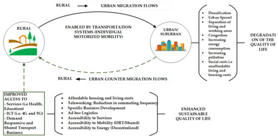 This unaffordability of living in cities, not only for low but also for medium classes, is highlighted by Fahra as UN Special Rapporteur (2020) [29]. This issue, along with the decline in quality of life and the rise of each time stronger sustainability conscience, seems to have prompted the reverse migration from cities to rural areas, especially in young, well-educated people, who in teleworking could find demand-responsive and shared transportation systems as the support to that decision, as shown in Figure 1. This trend seems to have increased as a consequence of the situation created by the COVID-19 pandemic, as different reports worldwide show (see for example [30,31,32,33]). The main question is whether this trend will continue after the pandemic and will become one of the factors configuring future societies and their mobility patterns, depending on technological, social factors, and gender issues [34].