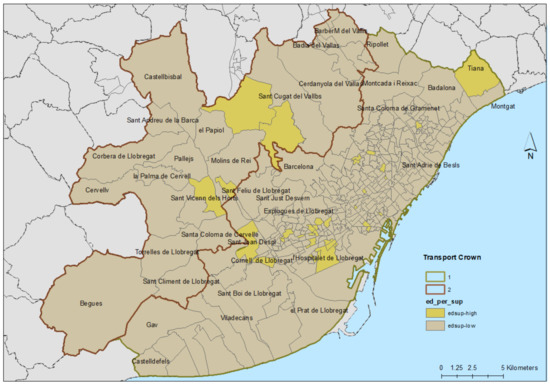 In 2016, the annual average household expenditure in Catalonia was 31 thousand euros [39]. Figure 2 shows the professional education per residential zones in the AMB. The traffic analysis zones used are the TAZ-EMO, which were defined in the Commuters’ Mobility survey in 2001 [40].