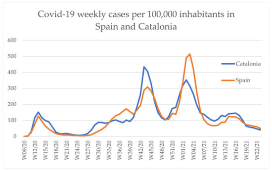 Weekly COVID-19 confirmed cases over 100,000 inhabitants in Catalonia and Spain (Original data source: https://www.idescat.cat/dades/covid19, accessed on: 21 June 2021).