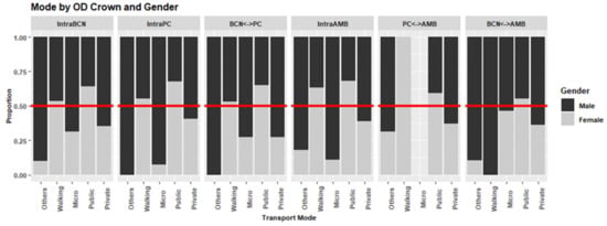 According to [43], approximately 25% of the daily mobility in the Municipality of Barcelona is a local trip, accessible by walking. As in other studies, gender determines modal choice and length of a trip. To solve constrained schedules, men increase motorization rates, whereas women increase proximity trips. This situation is possible thanks to the fact that educational and other public services are well dispersed within the municipality.