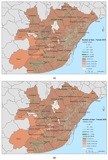 OD female trips in the Metropolitan Area of Barcelona in (a) 2019 and (b) 2020.
