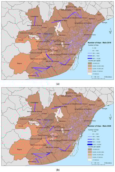 OD male trips in the Metropolitan Area of Barcelona in (a) 2019 and (b) 2020.