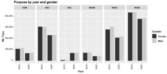 Figure 9 shows the number of trips per purpose between 2019 and 2020. It shows in general terms a significant reduction affecting all trip purposes but home-based nonfrequent trips (HBC). This point is interesting, and a possible assumption is that after the strict lockdown, many residents started carrying out outdoor activities, which may be registered as HBC trips. Further analyses, using for example a qualitative approach, may be necessary to understand this change.
