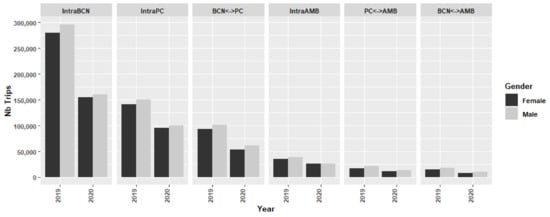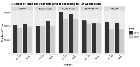 An exploratory analysis was carried out using the mobile phone data and considering the per capita rent information. The results are shown in Figure 11. They indicate that the total number of trips decreased from 2019 to 2020. However, they did not decrease homogeneously with respect to all socioeconomic categories: trips performed by low-income groups tend to be similar between 2019 and 2020, whereas teleworking seems to be a privilege reserved for medium-high and high-income groups, usually living in residential areas showing a large high-educational-level percentage. The study is limited to internal AMB trips made by AMB residents. This hypothesis will be checked in the next stage of this study through another GLM model. A gender effect is suspected and has been analyzed in greater depth without being able to confirm any statistically significant effect of gender because we lack detailed individual information to understand the behavior.