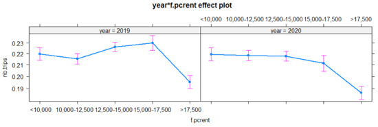 As can be noticed in Figure 12, people in the highest income group (defined by the variable f.pcrent) commuted less in 2019 in comparison to other income groups already before the pandemic outbreak. In 2020, after the pandemic outbreak, people in the lower-income groups, which in most cases are employed in frontline jobs, did not diminish their trip rate between 2019 and 2020. One can also observe that people with higher wages were the ones that diminished the most their number of trips between 2019 and 2020, in comparison to people with lower wages.