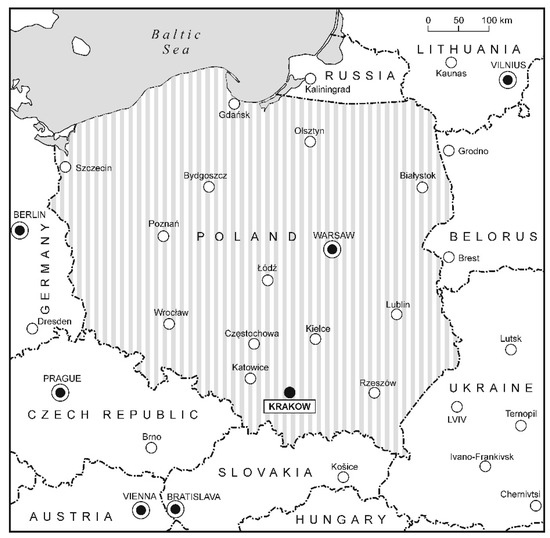 Kraków, the second largest city in Poland (inhabited by 781,000 residents in 2020 [47]) is located in the south of the country (Figure 3). As the former capital (1038–1609), Kraków is an historic European center where heritage has significantly determined its present position [48].
