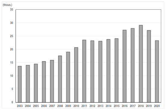 The capacity of tourist accommodation establishments: number of bed places in Kraków (2003–2020). Source: authors based on data from the Central Statistical Office [60].